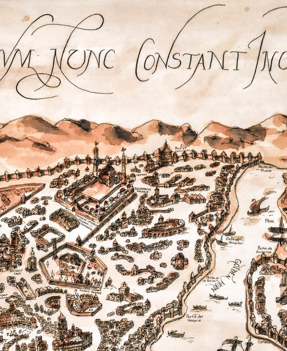 This piece is my personal interpretation of Constantinople, inspired by the 16th‑century city view Byzantium nunc Constantinopolis by Georg Braun and Frans Hogenberg, German cartographers whose detailed work captured the city at the height of Ottoman power under Sultan Süleyman I (1520–1566).