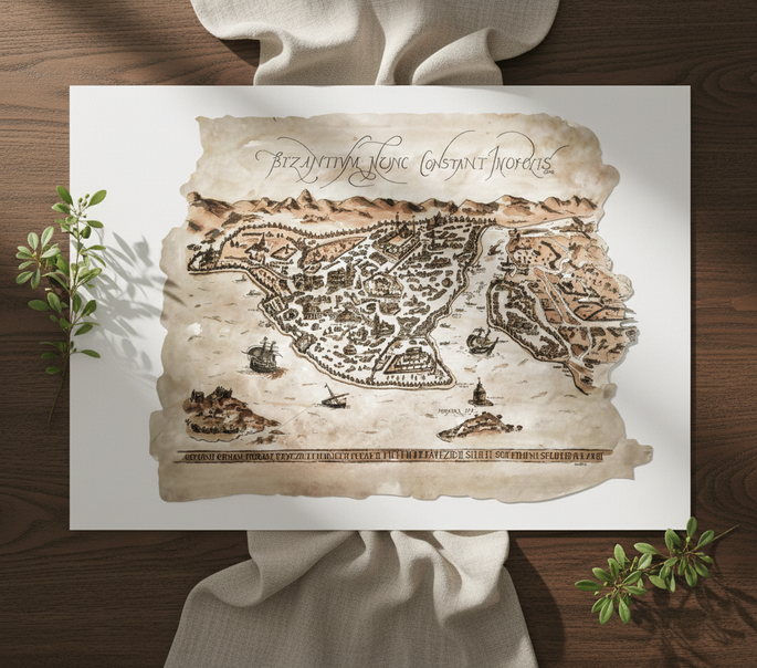 Rendered in ink with a wash of monotone color, the map highlights my take on the landmarks that resonate most: Hagia Sophia, the Süleymaniye Mosque, Topkapi Palace, and the Serpent Column, along with the Theodosian Walls and the Sea of Marmara. This approach emphasizes the structures that define the city’s character and layered history, blending Byzantine, Latin, and Ottoman heritage.